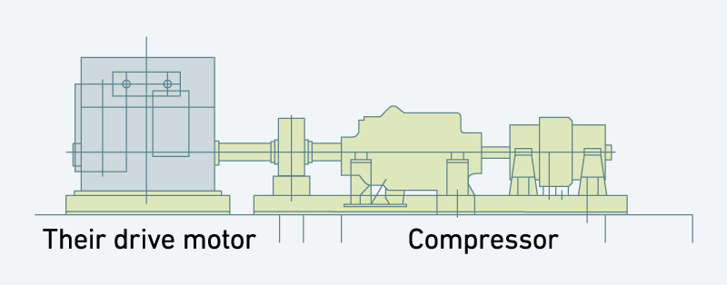 The photo at rightbelow shows the train of compressors (2 connected units, models 9H-7C, 5V-8B) for supplying gas as fuel for large-size gas turbines, and their drive motor, which were delivered to a LNG plant in Qatar. These are used to drive the processes involved in liquefaction of natural gas.