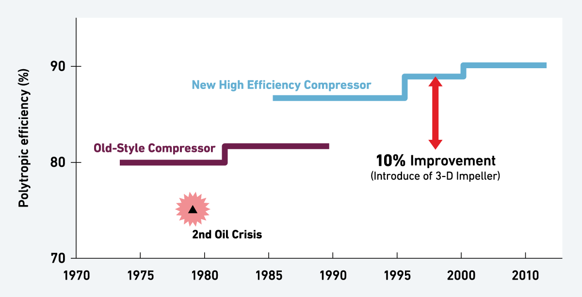 Early 1980s’ after the 2nd oil crisis, oil prices rose sky-high. and industries was under severe pressure to develop energy savings, especially in Japan which is oil dependent. In response to the demands of Japanese ethylene producers, MHI launched a new generation compressor in 1986 equipped with 3D impellers and around 10% improvement in efficiency over the conventional designs installed in Japan at that time.
