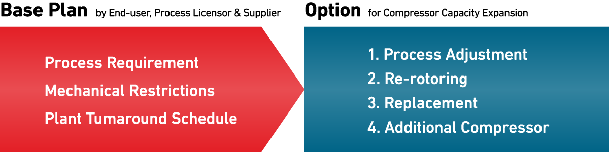 Step 4. By keeping existing compressor as it is, simply add new compressor train. MHI has experience for all of these options. Here, we will focus on Step 3 to show that using modern compressor technology can offer the potential for impressive operating cost.