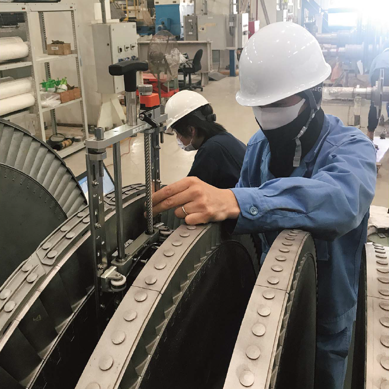A type of ultrasonic flaw-detection inspection for steam turbines. It can detect flaws in the rotor blade while the rotor is in an assembled state, so we use it for maintenance inspections. Detecting and repairing structural defects ensures long-term operational reliability, and the number of inspections performed has been increasing in recent years.