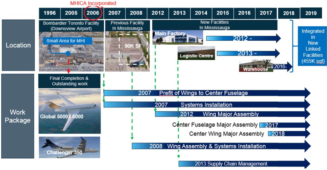 In 2007, MHICA acquired an 90K sq. ft. facility in the City of Mississauga to perform the wing-to-fuselage pre-fit and systems installation Global Business Jet for Bombardier Inc..