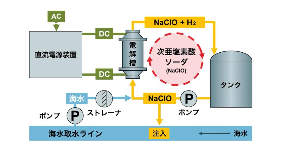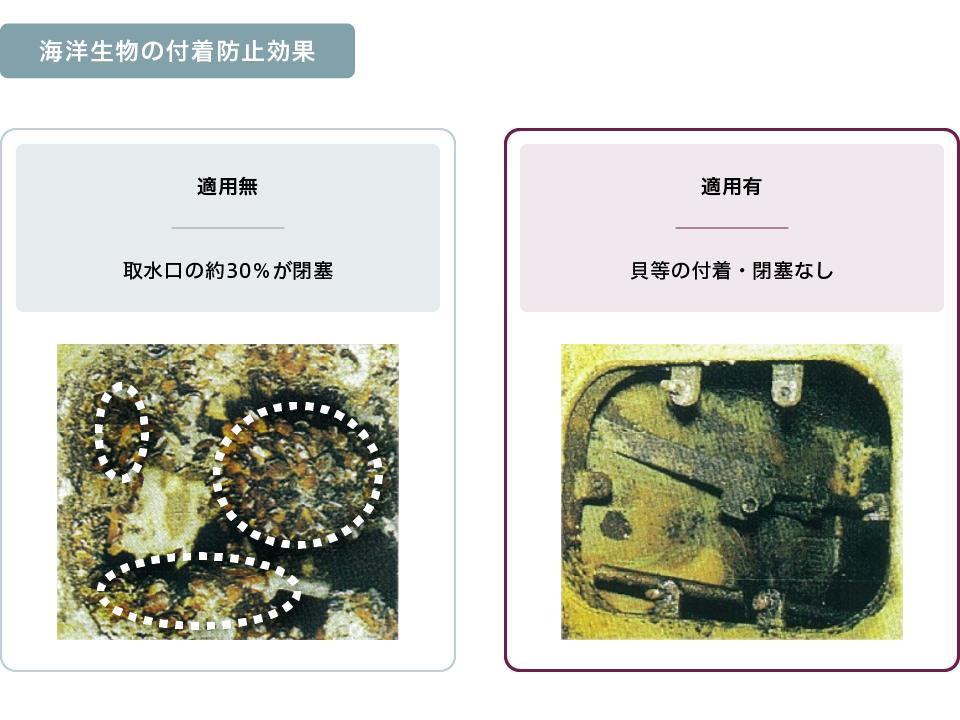 海水を大量に使用するプラントにおいては、取水口や配管、復水器、各種冷却器などの海水と接する部分の藻類や貝類の着床繁殖が大きな問題となります。