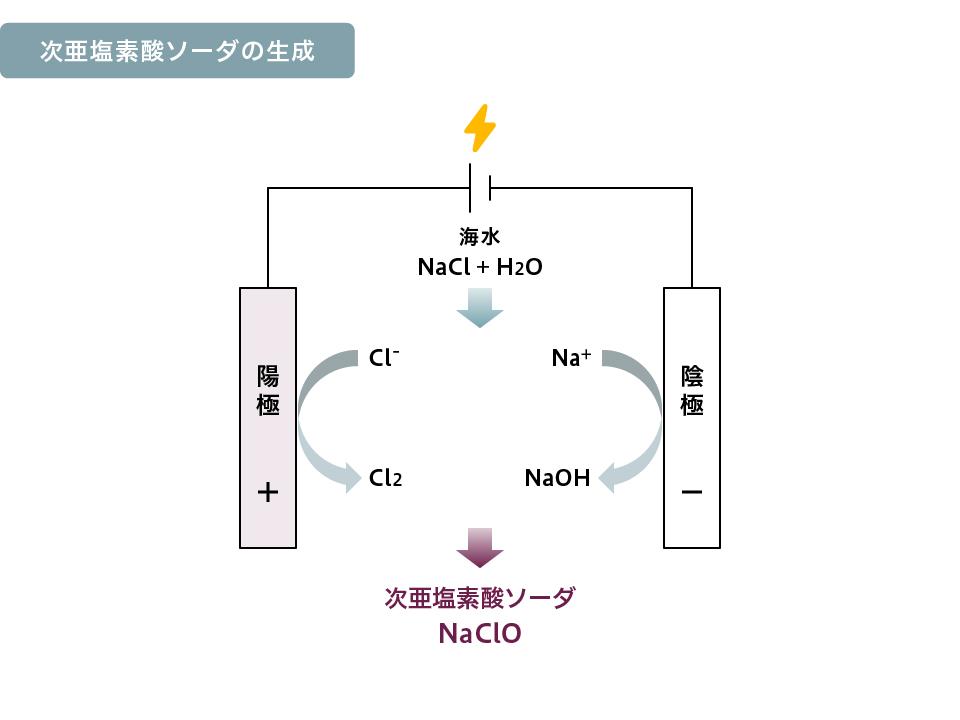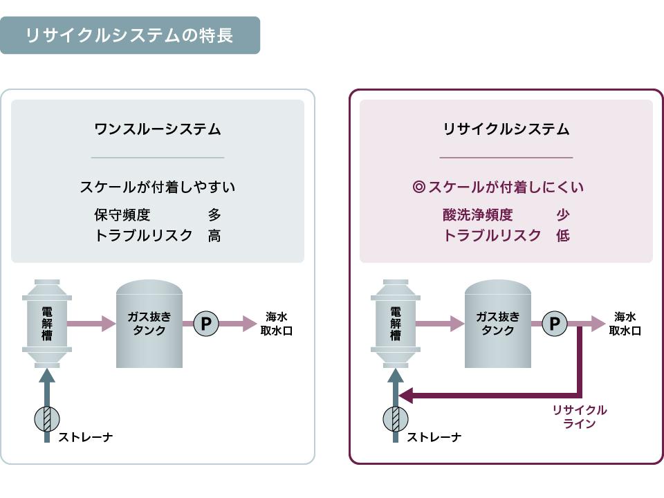 放流口では、次亜塩素酸ソーダがほとんど消費されてもとの海水に戻るように設計されていますので、まったく無公害なものとして安心してご使用いただけます。