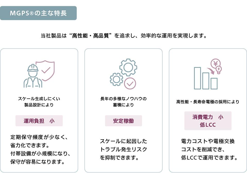 海洋生物付着防止装置(MGPS)は、天然の海水をそのまま電気分解して次亜塩素酸ソーダを生成させ、取水口に注入することにより、効果的に藻類や貝類(フジツボ、ムラサキ貝等)などの海洋生物の付着を抑制する装置です。