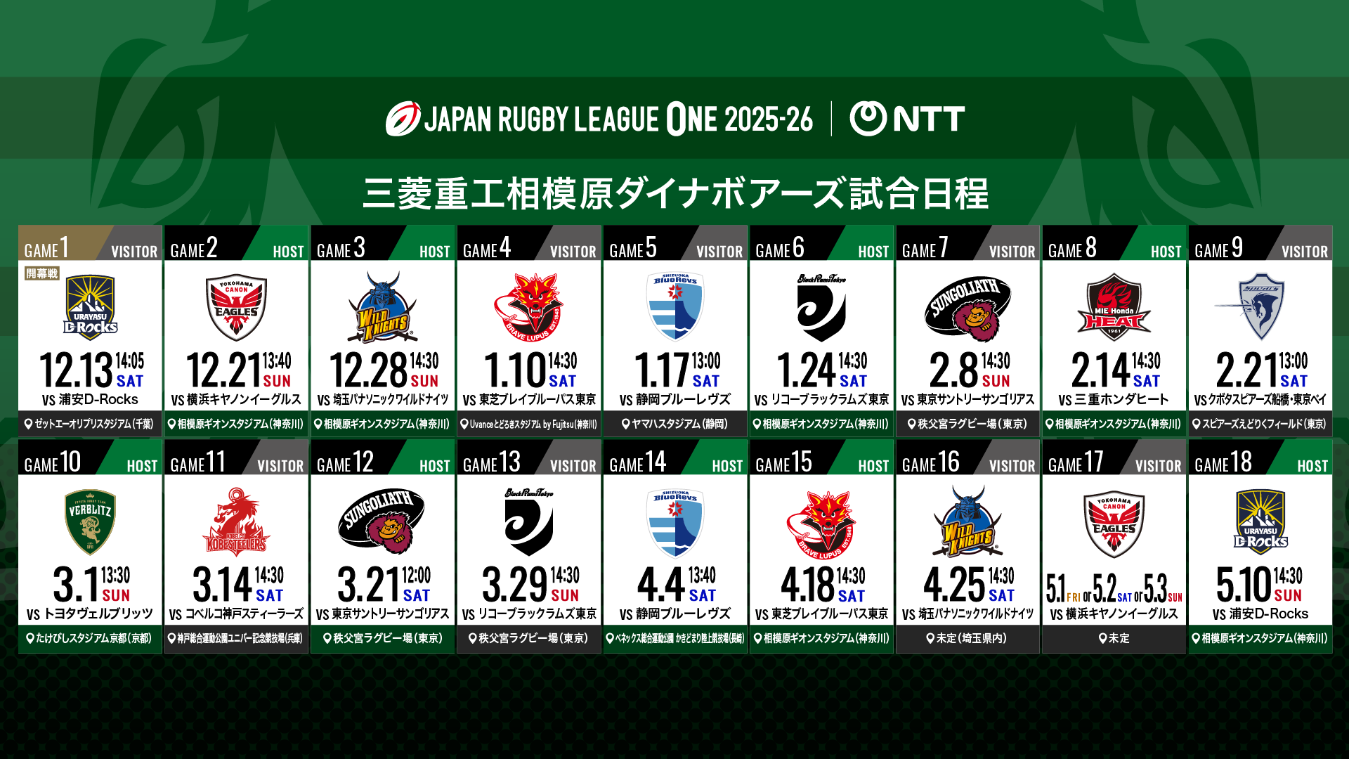日程更新|NTTリーグワン2025-26 4月・5月のホスト試合はホーム相模原開催!