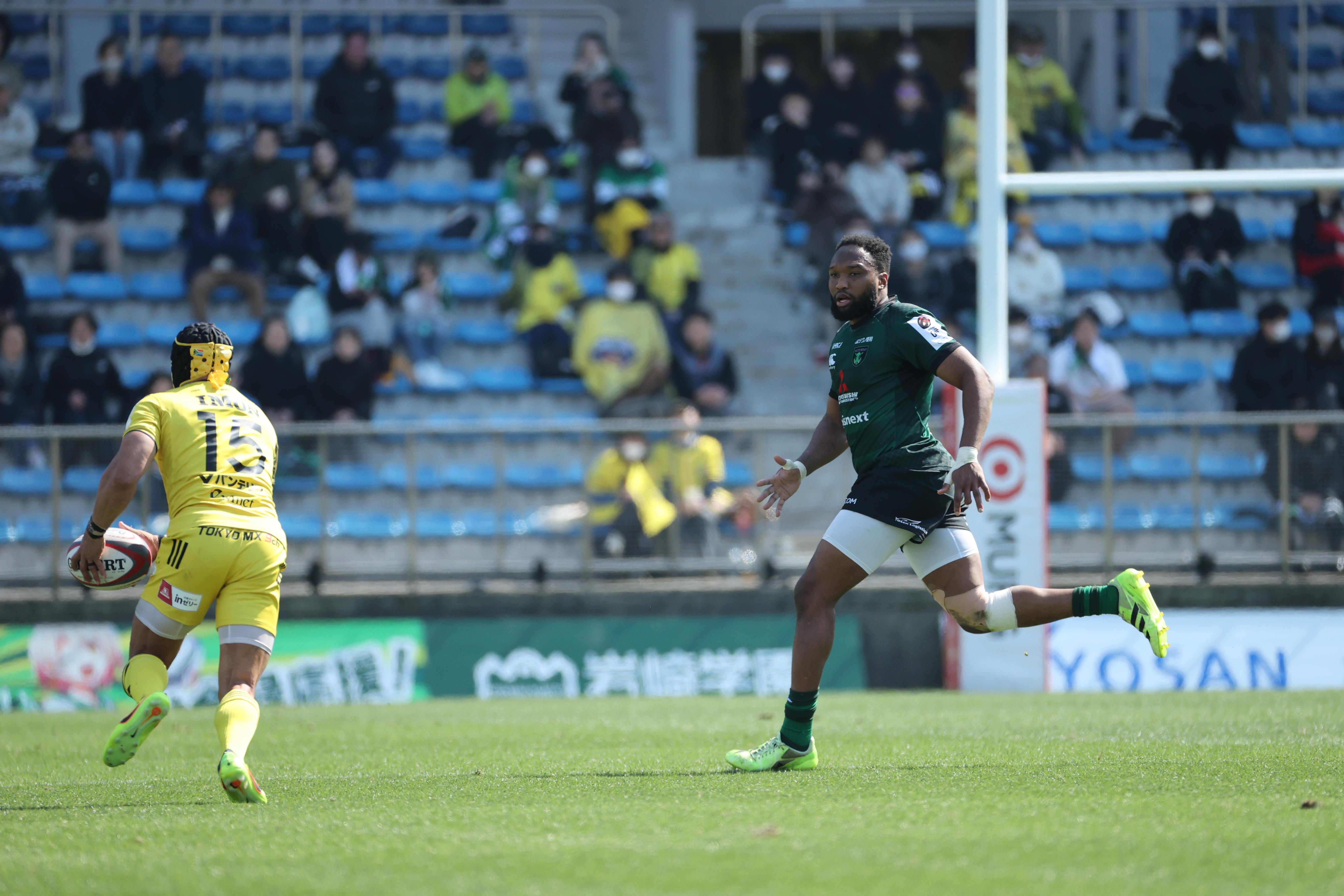 しかし、この日のハイライトは攻撃シーンだけにとどまらなかった。後半、アムのトライ直後の場面だ。サンゴリアスの快足ウィング、チェスリン・コルビが爆発的なスピードでダイナボアーズ陣内へ侵入。独走かと思われたその時、背後から猛然と追走したのがアムだった。アムは最後の一歩でコルビを捉え、タッチラインの外へと押し出す。