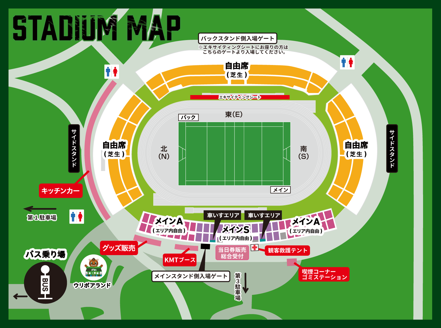 ■エキサイティングシート/自由席(芝生)は「バックスタンド側入場ゲート」を、メインA/S(エリア内自由)は「メインスタンド側入場ゲート」をそれぞれご利用ください。