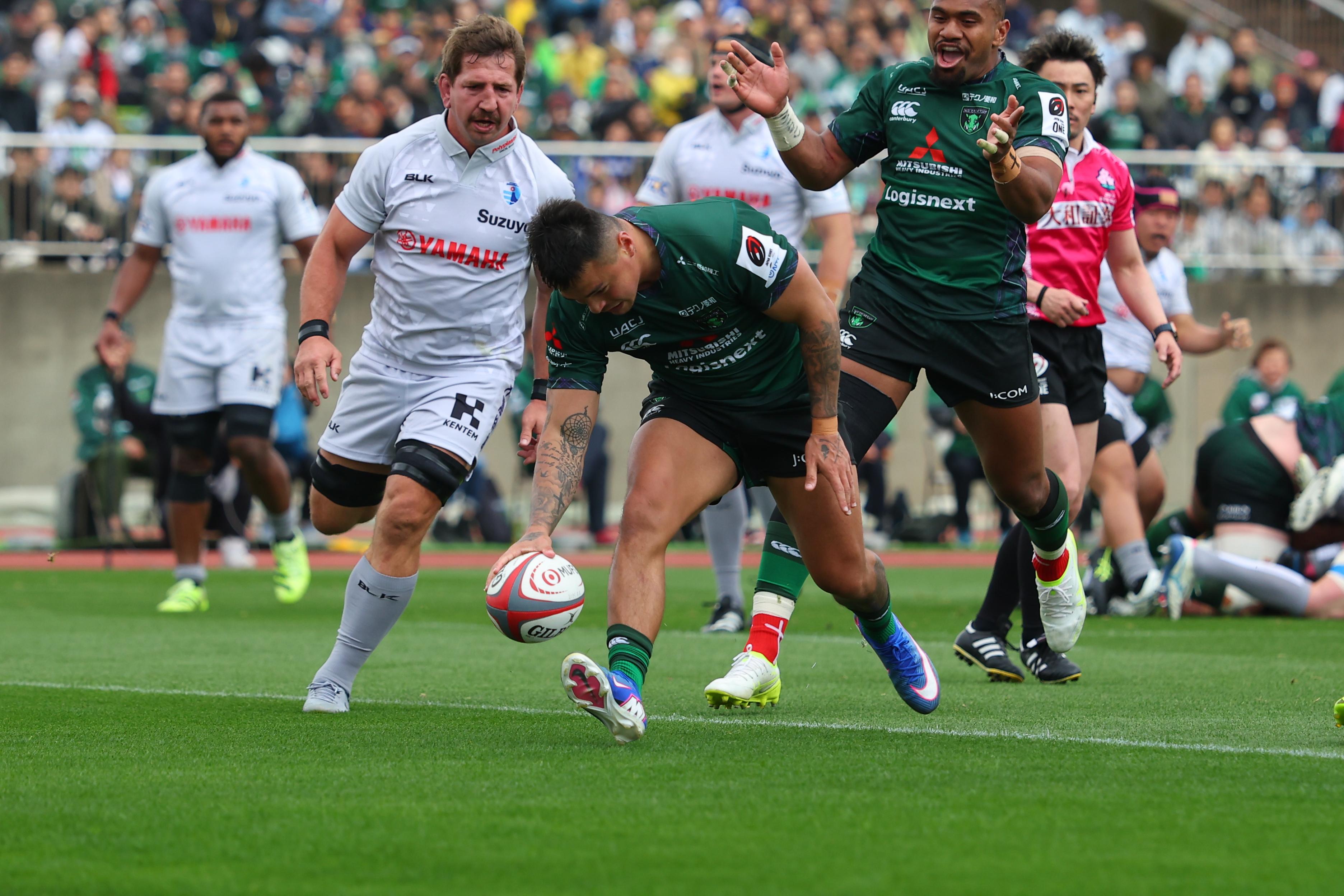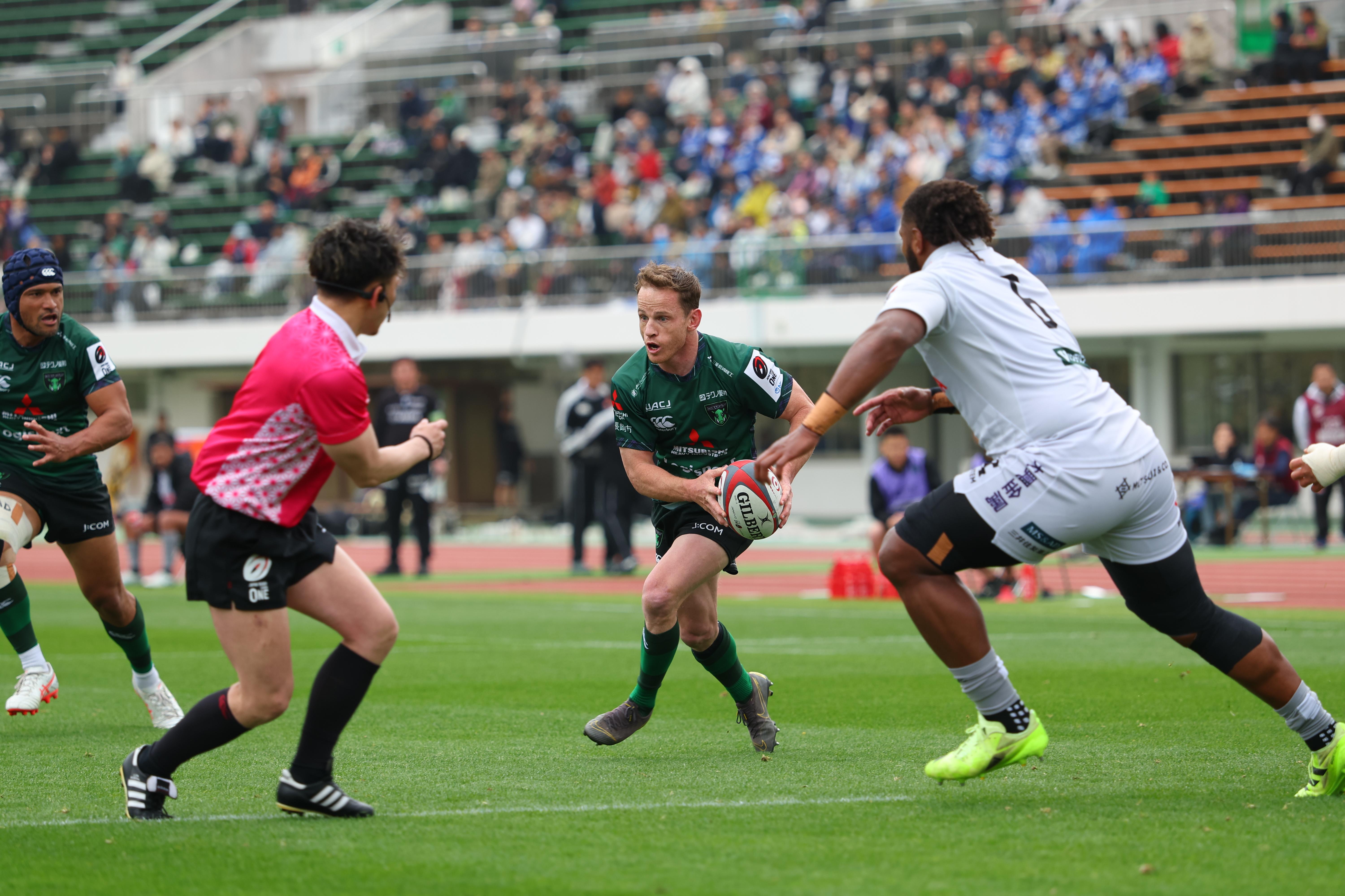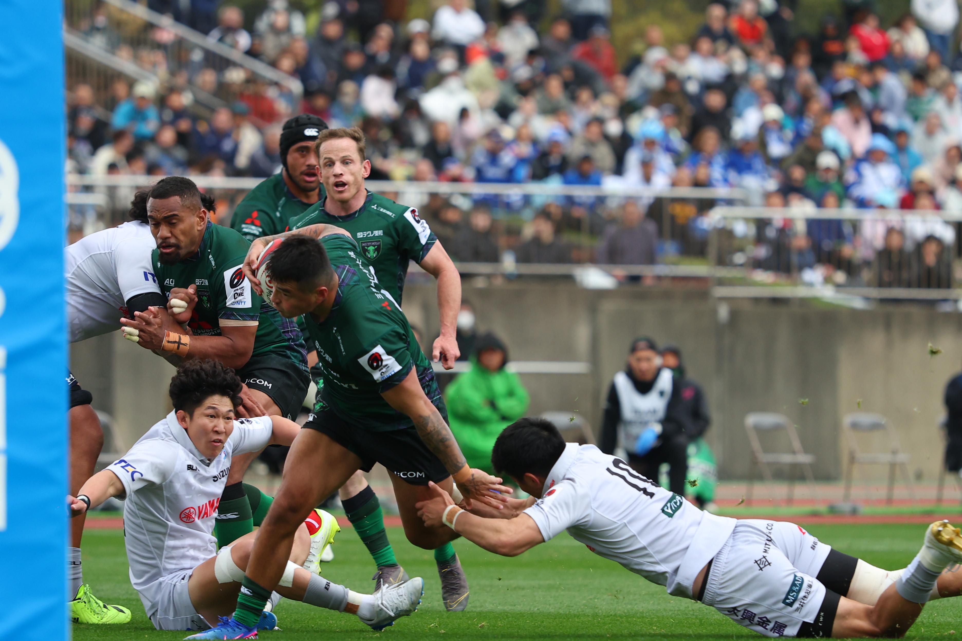 試合は序盤から激しく動いた。風上に立った前半、ダイナボアーズがプラン通りのラグビーを展開。グレン・ディレーニーHCが「狙い通りのラグビーができました」と振り返る通り、テンポの良い攻撃で次々とスコアを重ねた。圧巻はSHブラッド・ウェバーのトライだ。かつてのチームメイトから学んだという鮮やかなフェイントでディフェンスを翻弄し、敵陣を切り裂いた。前半をリードして折り返し、勝利への期待は高まった。