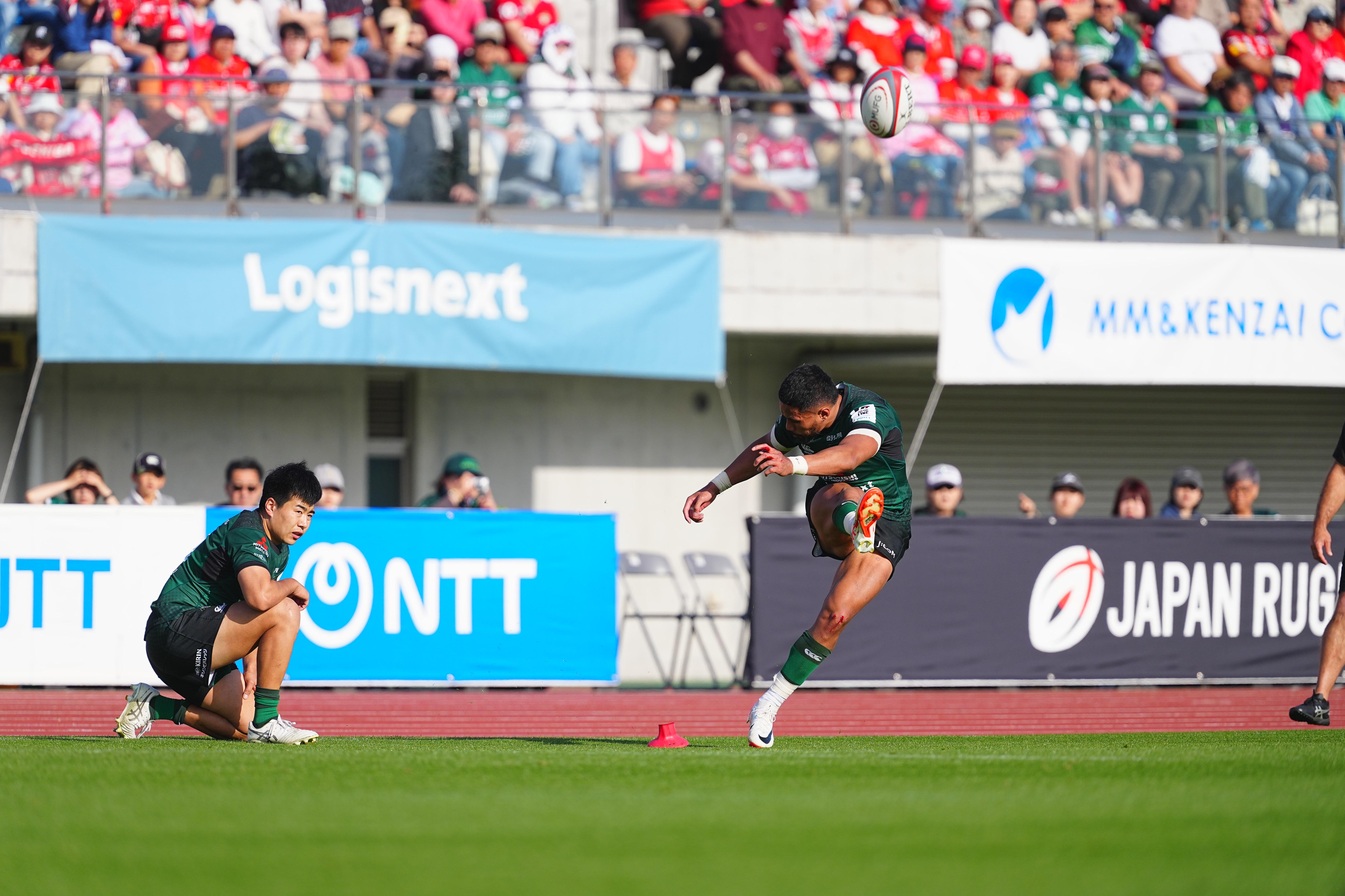 これでヴァエガの今季トライ数は13となり、リーグ単独2位に浮上。コンバージョンキックでもサイドライン際の難しい位置から成功させ、会場を沸かせた。