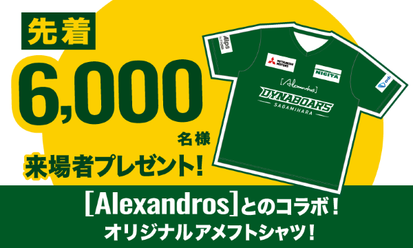 ダイナボアーズによるシーズン初戦恒例の来場者プレゼント。今回は相模原にルーツを持つ人気バンド[Alexandros]のロゴが入ったアメフトシャツを配布!当日ご入場いただいた方から先着6,000名様にプレゼントします。