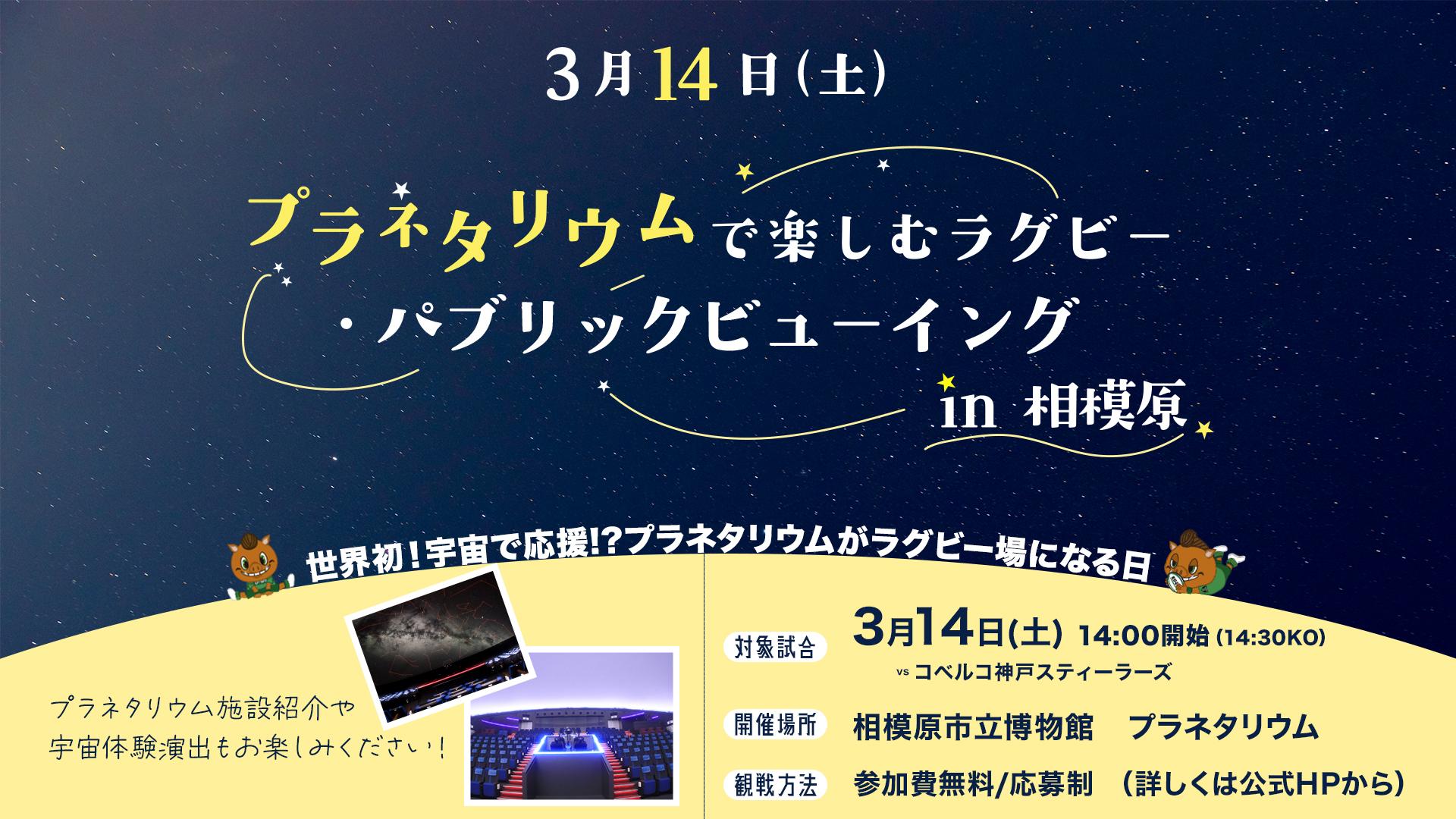 本イベントは、地域に根差したクラブ活動の一環として、市内におけるラグビー競技およびクラブへの理解促進を図るとともに、相模原市立博物館プラネタリウムの新たな活用価値を地域の皆さまに発信することを目的としています。プラネタリウムという空間での特別な観戦体験を通じ、新たな楽しいコンテンツを市民およびラグビーファンの皆さまに提供します。