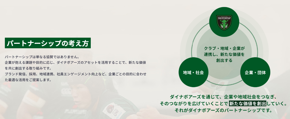 ダイナボアーズは『ラグビーを通じて、すべての人々と、夢と感動をともにわかちあい、ともに成長していく』というミッションのもと、グラウンドでの勝利だけでなく、地域や社会の課題解決にも全力で取り組んでいます。そんなダイナボアーズとのパートナーシップは、パートナーのブランド価値向上や機会の創出、地域社会への貢献といった課題を解決する一助となる“プラットフォーム”へと進化しています。