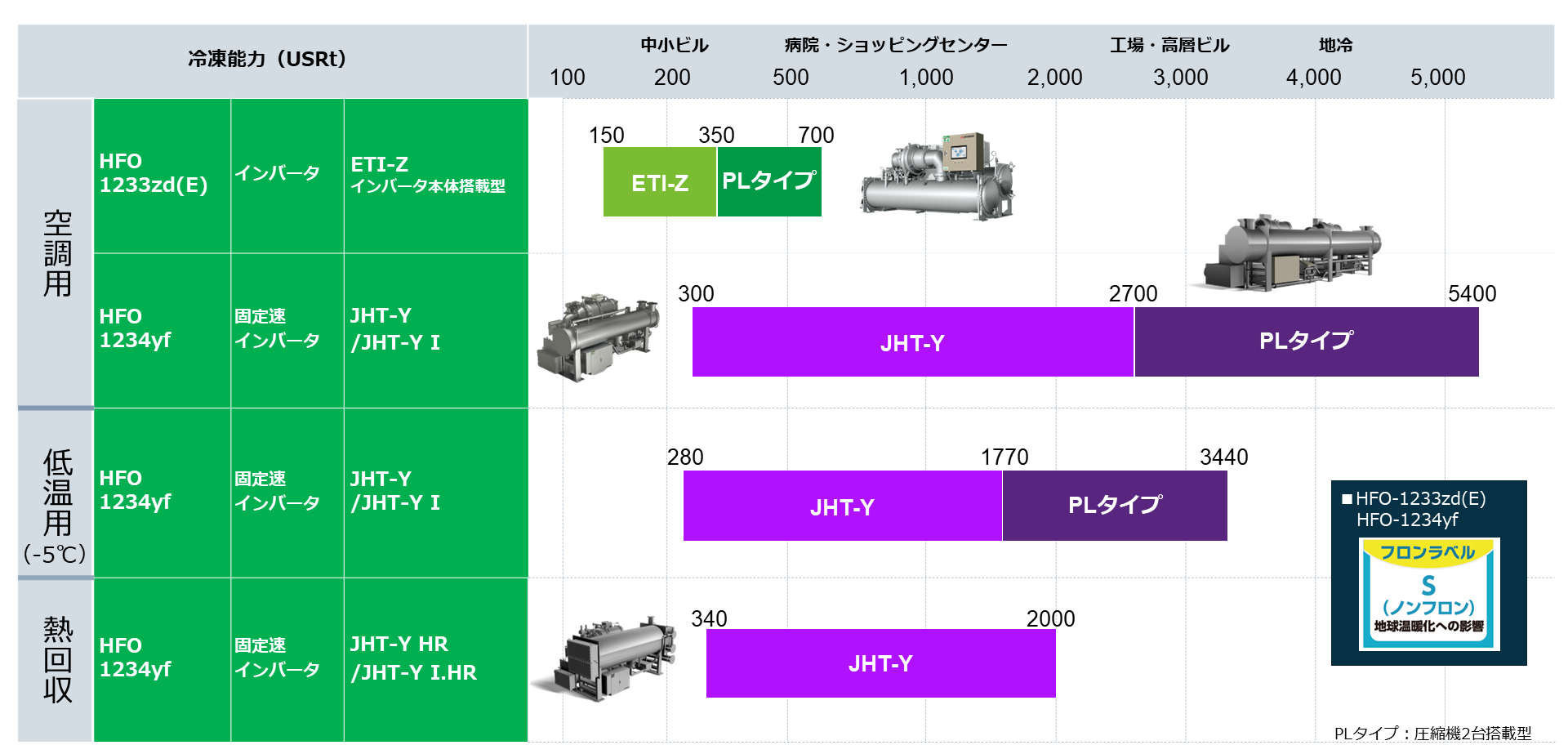150〜5,400 USRtまで、ノンフロン扱いの低GWP冷媒採用ターボ冷凍機を取りそろえています。