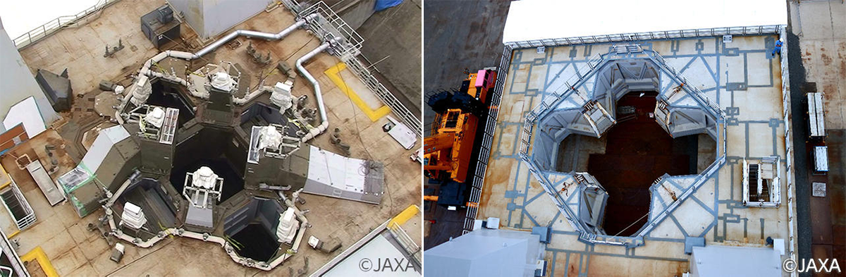 左が従来(H-IIA/B)の発射台、右がH3の発射台。上面の開口部を大型化し、台の上面には設備が露出しないように改良した。