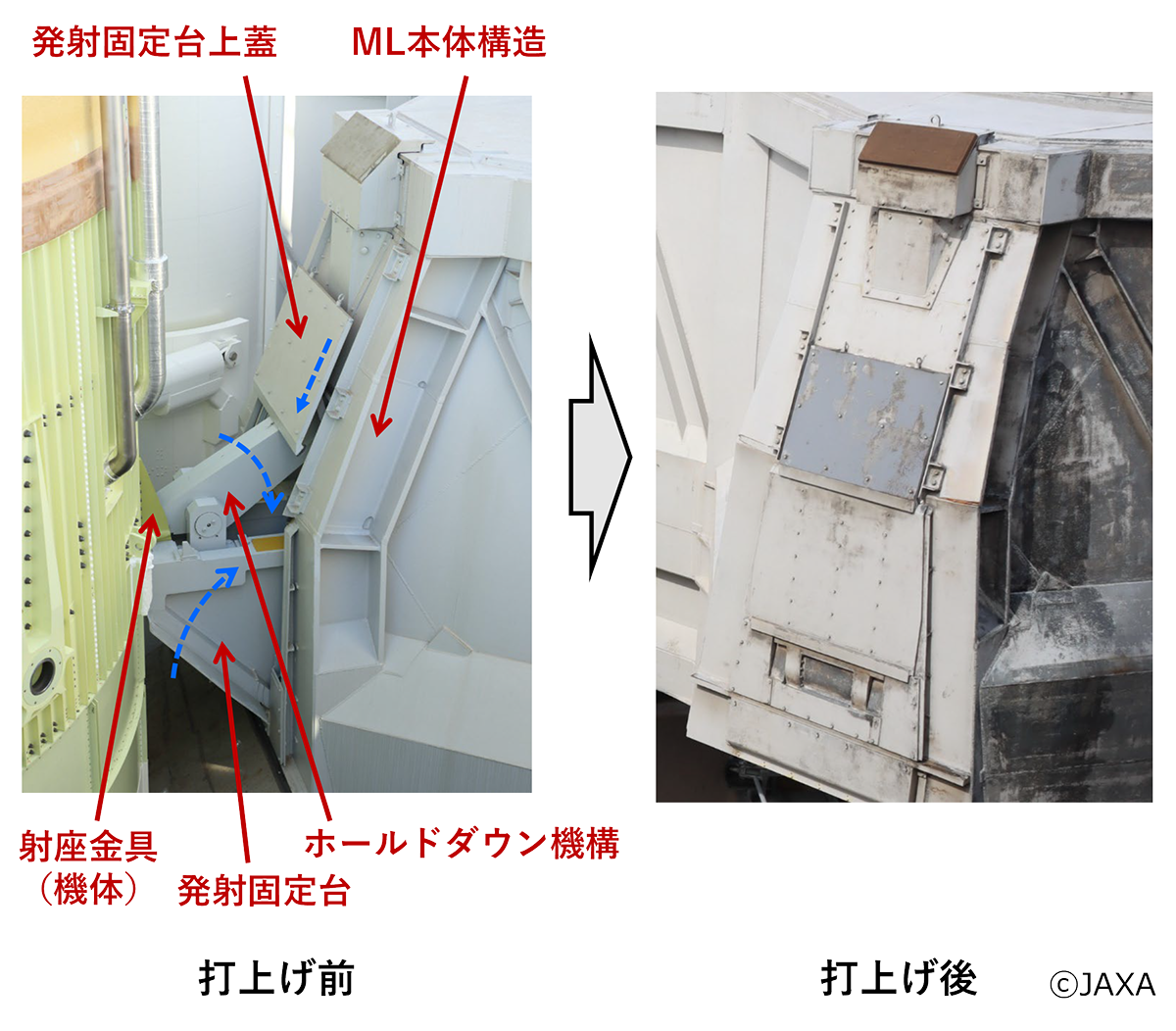 打上げに向けたML5の改修に対応してきたO.Mが説明するように、ロケットを支えていた発射固定台はMLの開口部の側面に格納でき、上昇するロケットにぶつからず、自身もエンジンの噴流から守ることができるようになっている。