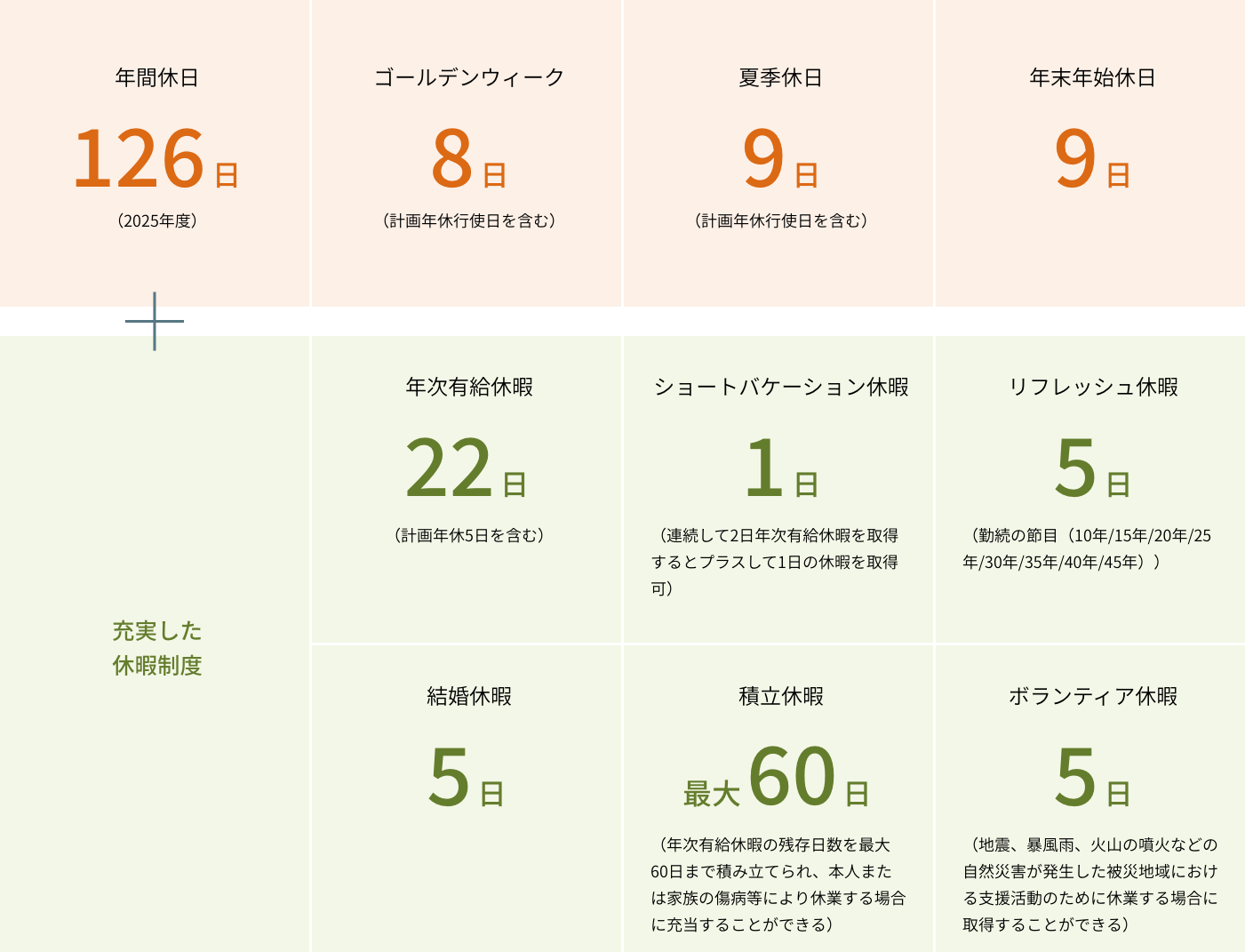 会社休日に加え、様々な種類の休暇制度があります。詳しくは下記「年間休日」をご覧ください。