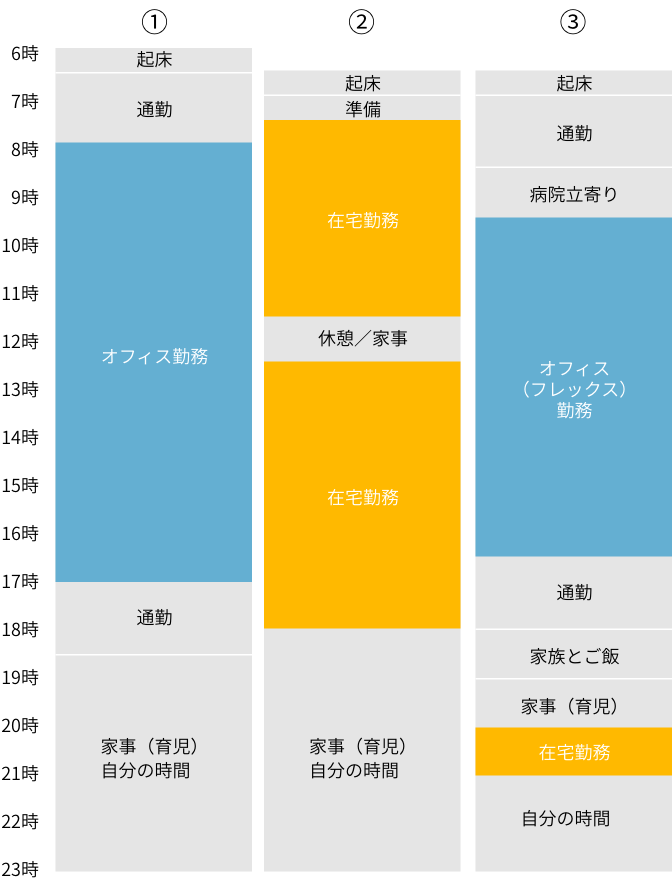 ③フレックス勤務と在宅勤務を組み合わせた例です。