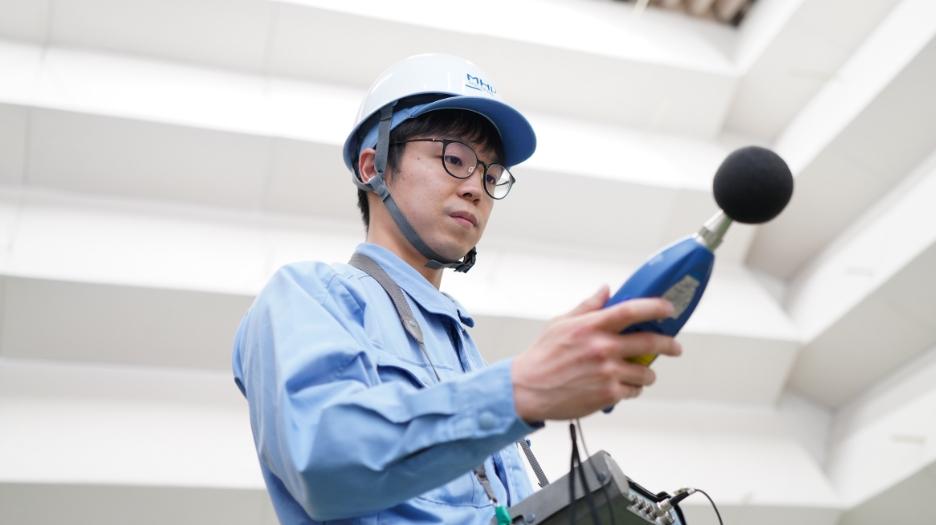 長崎を拠点に、振動と騒音の計測から分析までを行い、依頼元である三菱重工の総合研究所にデータを提供しています。現地に直接足を運んで騒音や振動の原因を特定し、防音材の設置や振動を抑えるための対策を提案することが多いです。大きな建物を対象とすることも多くあり、一つの場所で様々な条件での計測を行うため、一つのプロジェクトに2~3ヶ月を要することもあります。チーム体制はプロジェクトによりますが、多い時には5~6名で協力して進めています。
