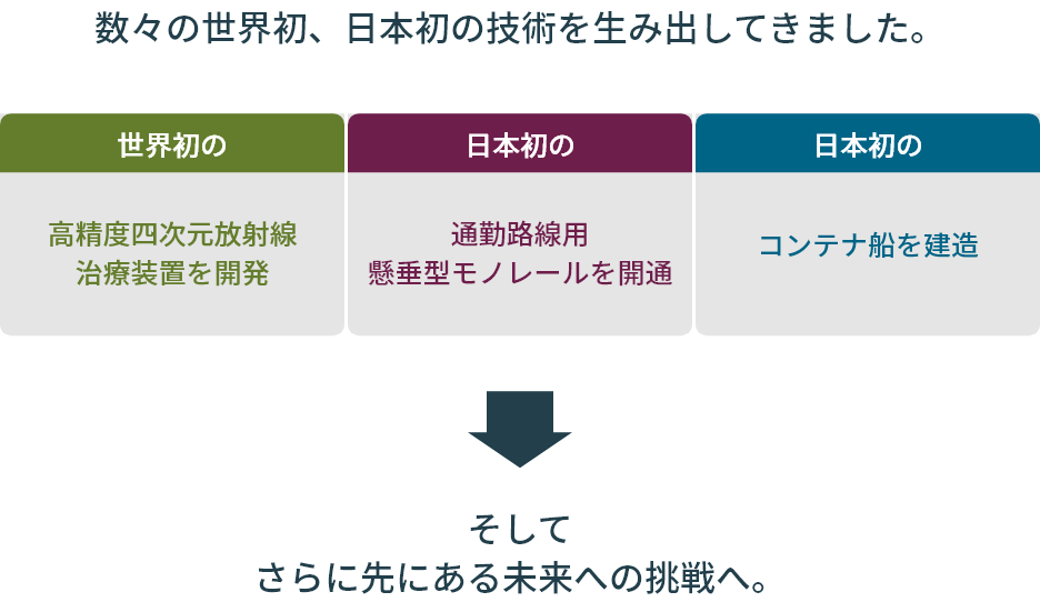 三菱重工は、「自ら社会やお客様の課題やニーズを見つけ出し、価値を提供する」企業です。モノをつくるだけではなく、モノを使うことによって得られる付加価値までをいかに提供できるか。そのために、技術や複数の事業を横断的に組み合わせ、社会やお客様に提供できるソリューションの幅を広げています。