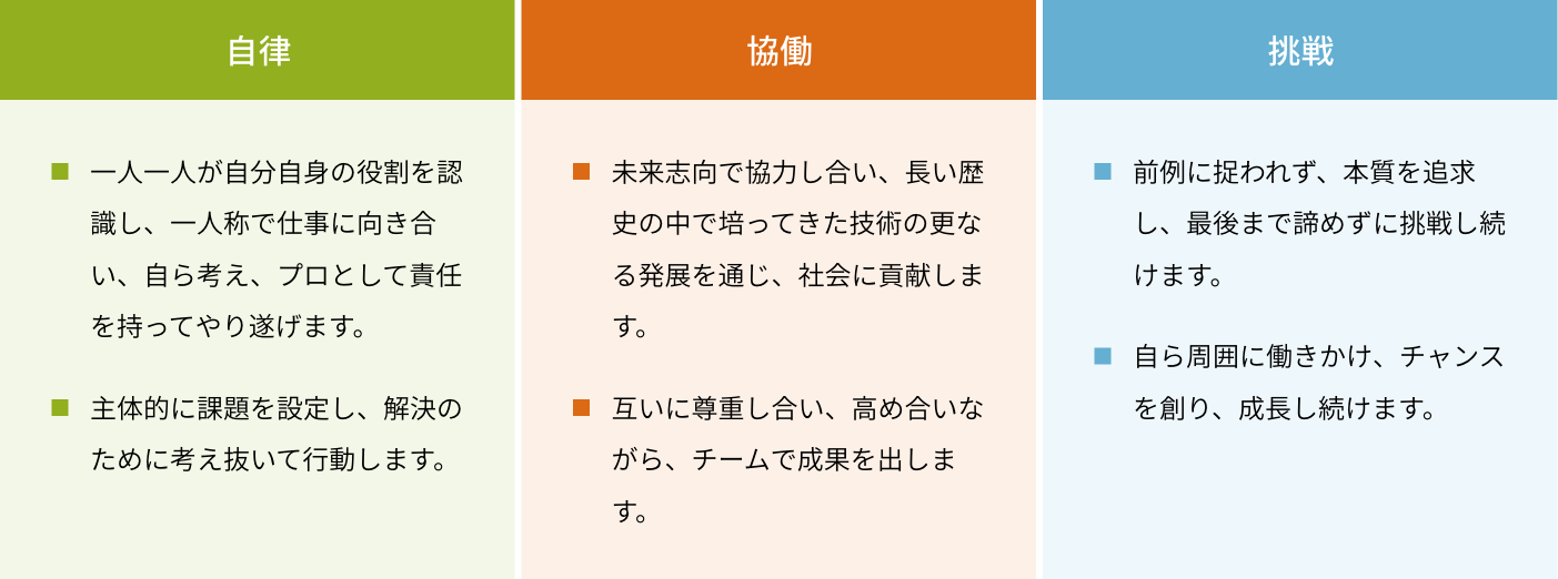 自律、協働、挑戦の3つの価値観は、「自律、つまり自ら主体的に行動し、チームで協力しながら社会課題の解決に挑戦していく」という三菱重工グループ社員に求められる行動を示すものです。三菱重工グループは、この3つの価値観を軸として人材育成を推進しています。