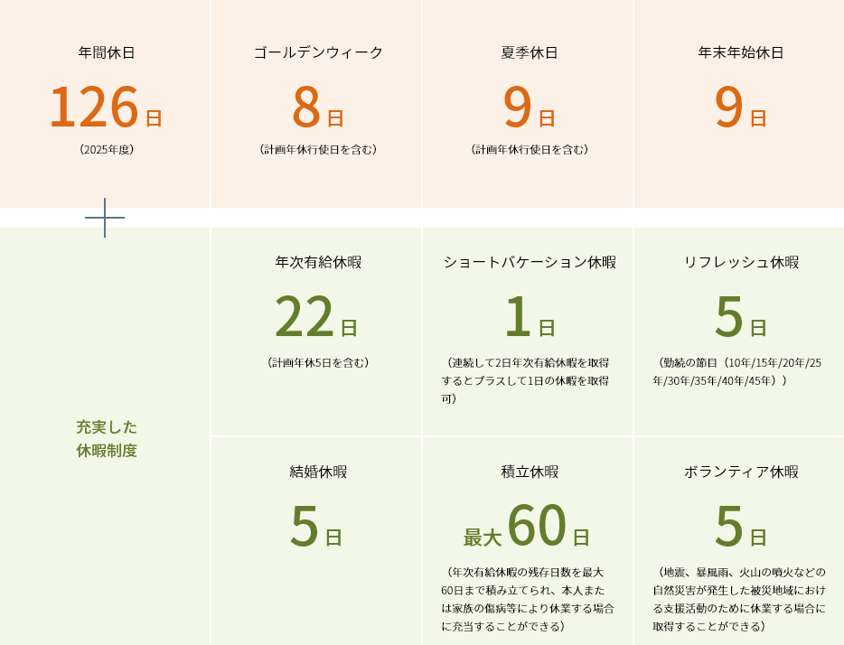 会社休日に加え、様々な種類の休暇制度があります。詳しくは下記「年間休日」をご覧ください。