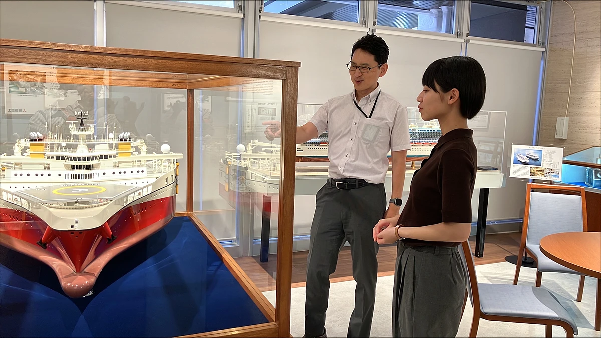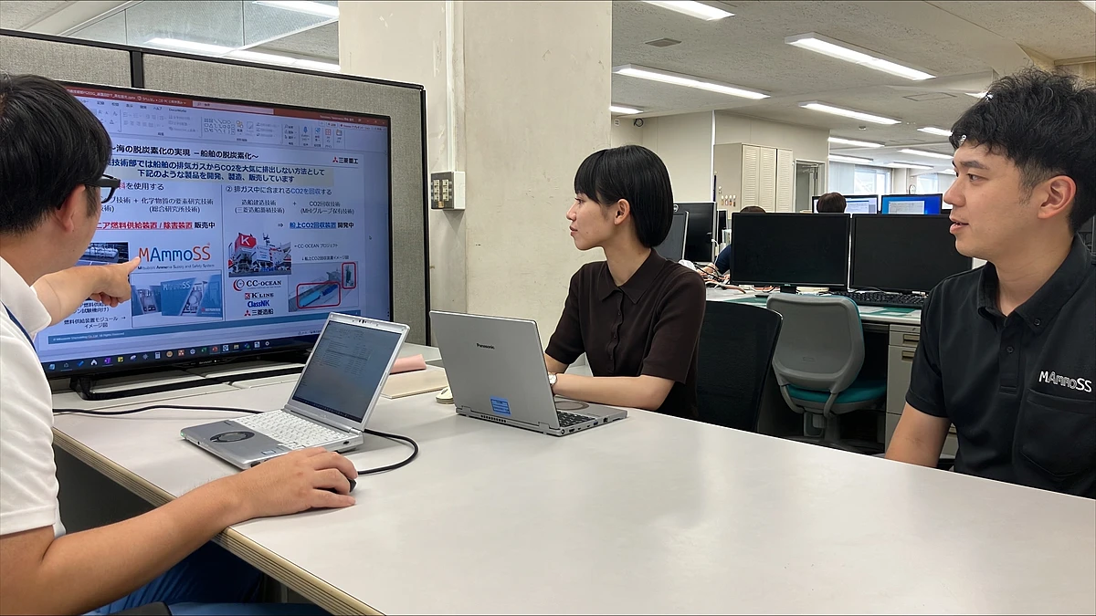 2025年春に三菱造船株式会社(以下、三菱造船)に入社し、マリンエンジニアリングセンター 環境技術部 開発グループで働く塚原 佳穂。船舶に搭載する「船上CO2回収システム」の開発に携わる塚原が、開発グループ長 加納 裕真と入社理由や仕事への向き合い方、そして思い描く未来について語ります。