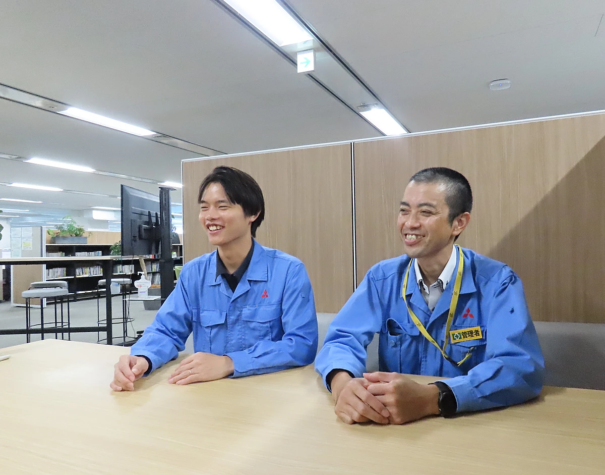 原子力セグメント 電気計装技術部 制御システム設計課で課長を務める田中 佑一と、設計者の野口 颯馬。原子力発電プラントの計測制御システムなどの設計に携わる2人が、システム全体の基本計画から制御盤製作設計まで一気通貫で手がけるやりがいや、働く上で大切にしている価値観について語り合います。