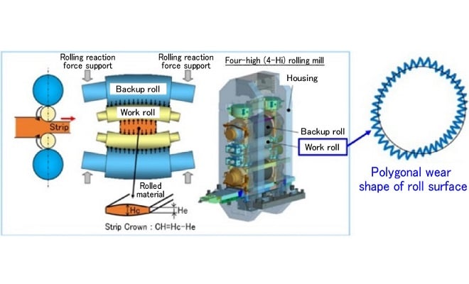 It is known that the work rolls of rolling mills are subjected to polygonal wear caused by self-excited vibration. To consider countermeasures for this phenomenon, it is necessary to identify the natural frequencies of the rolling mill and evaluate the vibrations during actual operation. Therefore, in this report, to estimate the vibration modes during operation of the rolling mill that lead to polygonal wear of the work rolls, a simulation model was developed coupling Multi-Body Dynamics with rolling theory and a wear model. This model is capable of simultaneously evaluating the behavior of the rolling mill during operation and the progress of wear, taking into account the dynamic model of a four-high rolling mill. This has made it possible to identify the vibration modes that cause roll wear and to consider preventive measures such as structural changes and installation of dampers and monitoring sensors.